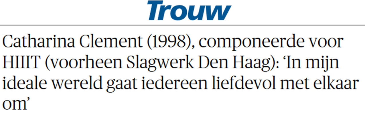 – Catharina, 12 April 2025Through composing and singing, Catharina Clement (1998) aims to express herself and touch her listeners. She has an affinity with interdisciplinary art forms as well as vocal- and acoustic music, ranging from solo instruments and monodrama's to opera, choir and orchestra. Her music, frequently containing a lyrical, eclectic, and colourful nature, is mostly inspired by personal stories, philosophy, fantasy, spirituality and nature.Catharina has written for renowned musicians such as the Royal Concertgebouw Orchestra, Netherlands Philharmonic, Nederlands Blazers Ensemble and HiiiT/Slagwerk Den Haag, and her music has been performed at venues as Concertgebouw, Oskar Back Prijs, Wonderfeel, Nationale Opera & Ballet Amsterdam and Aurora Festival.Currently, Catharina is composing a chamber opera as well as the compulsory lied for the International Student LiedDuo Competition - Groningen 2026.Catharina graduated at the Conservatorium van Amsterdam (BA), being supervised by Willem Jeths, Meriç Artaç and Richard Ayres in composition and by Pierre Mak and Sasja Hunnego in classical singing. In 2021, she graduated as a musicologist (MA, Universiteit van Amsterdam), focusing on forbidden music during World War II.